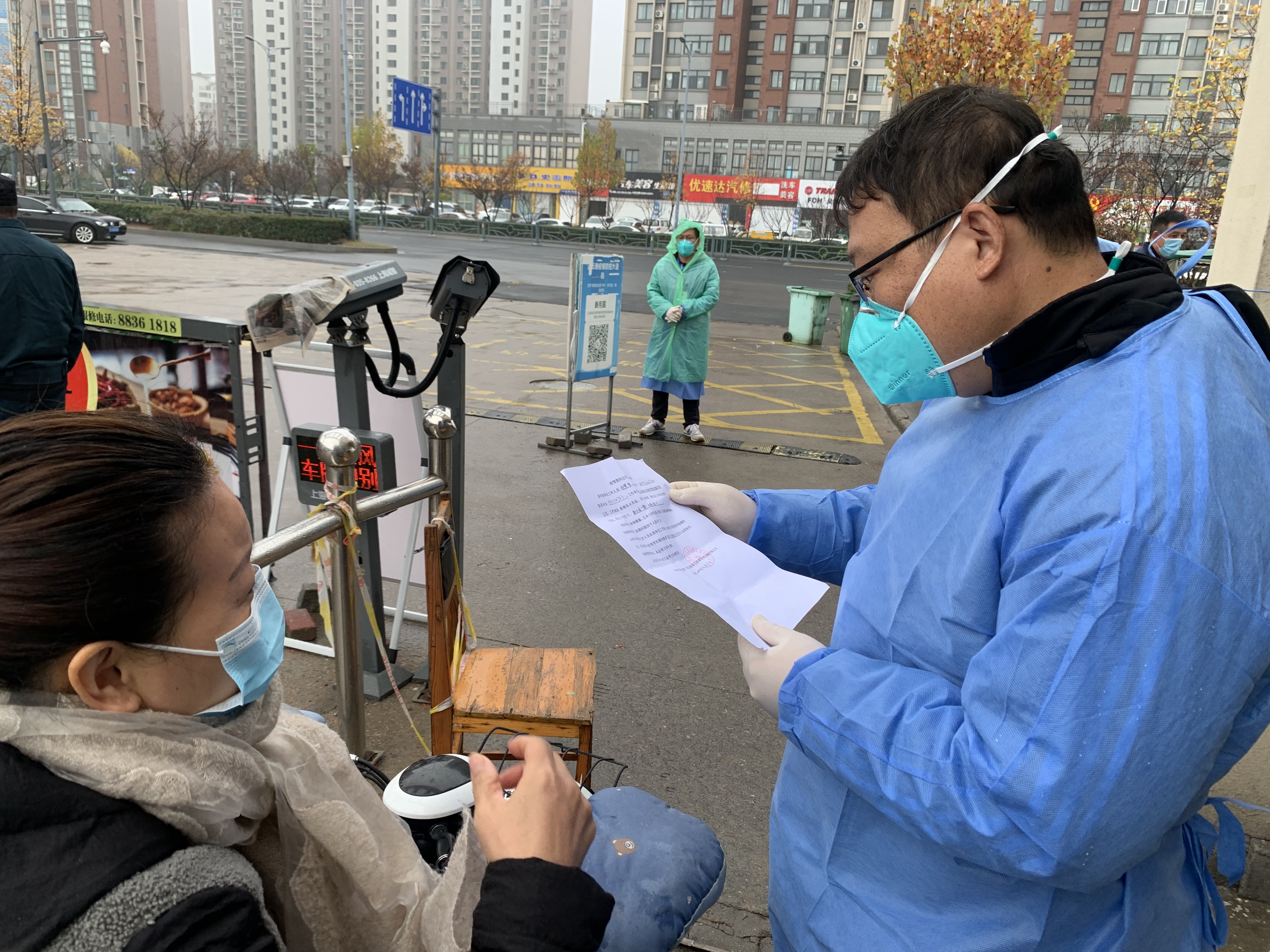 由于新桥社区多为自建房,门牌号混乱难找,房地产和资产公司的志愿者们冒雨坚守,逐户排查登记信息,宣传防护知识,讲解防控要求,并对重点监控住户安装防疫门磁。