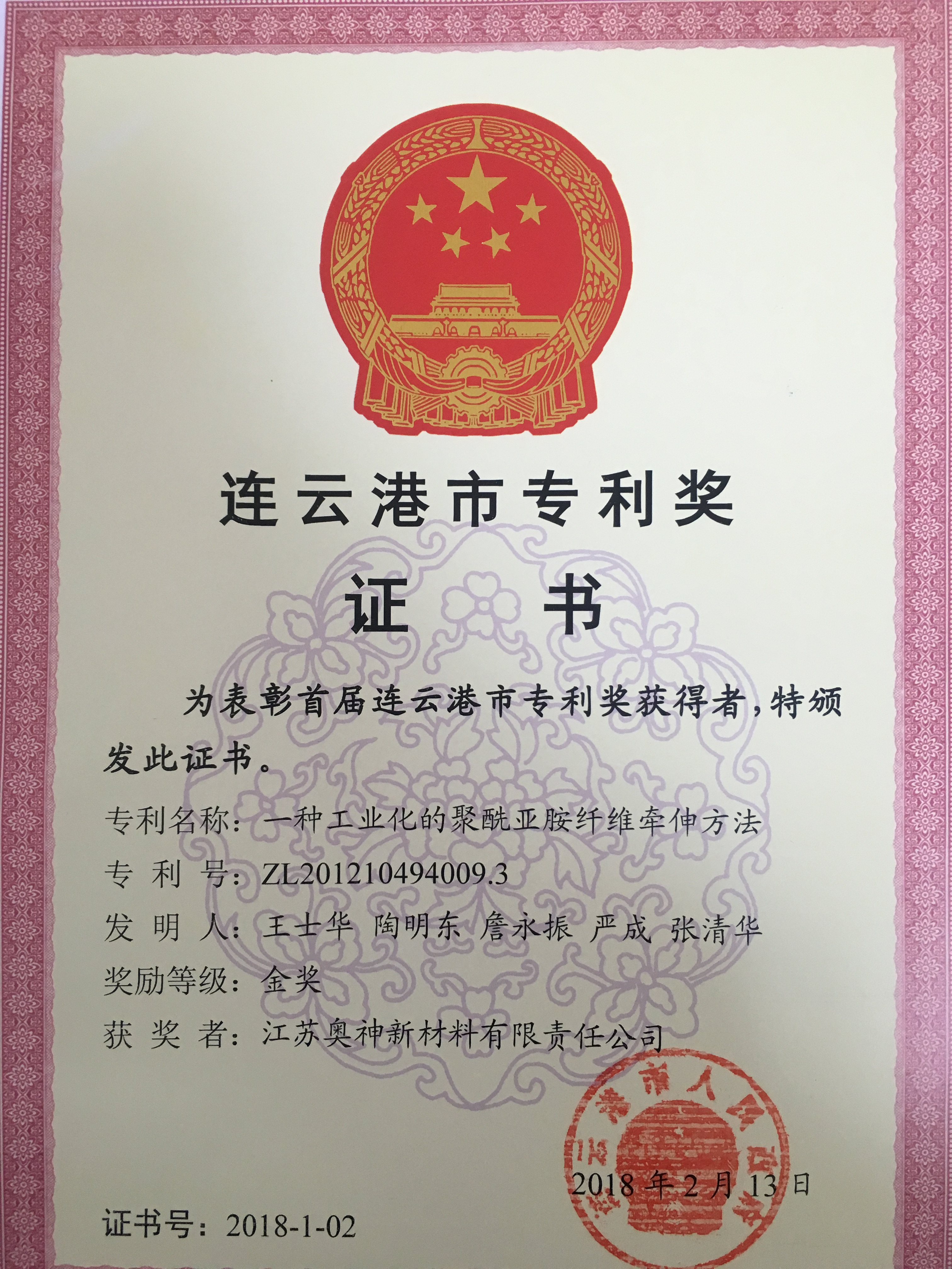 近日,奥神新材料公司“一种工业化的聚酰亚胺纤维牵伸方法”专利喜获首届连云港市专利奖金奖。