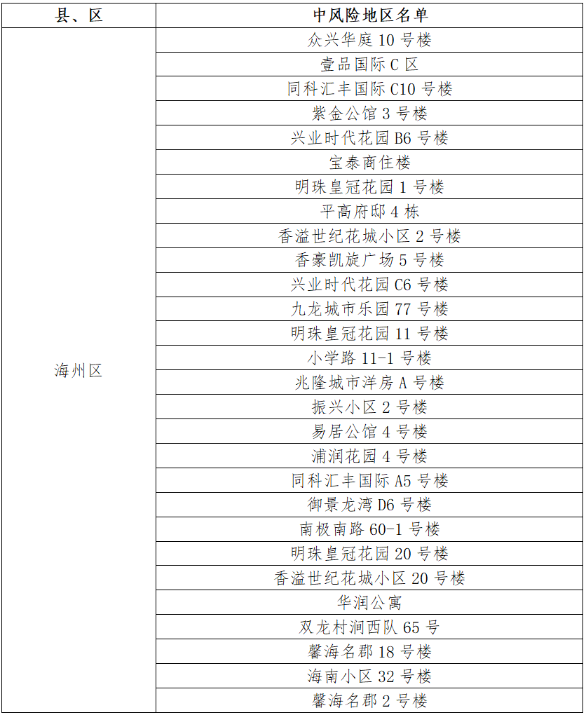 根据国务院联防联控机制有关规定,经市指挥部研究决定,自发布之日起,对我市部分区域疫情风险等级进行调整:海州区天顺国际花园7号楼、凤凰名都10号楼、御景龙湾C1号楼、天顺国际花园11号楼、御景龙湾A4号楼、香溢江南小区12号楼、同科汇丰国际A2号楼、平高书香名邸1号楼、香溢江南小区7号楼、西门村杨凤庄21号、凤凰名都9号楼、园林村白虎山小区78号楼、江化北路82-5号、金色大漠、平高书香名邸4号楼、朐阳街道花园路1号、制药巷5-114、万润泰和苑4号楼由中风险地区调整为低风险地区。其他地区风险等级不变。调整后全市现有28个中风险地区。