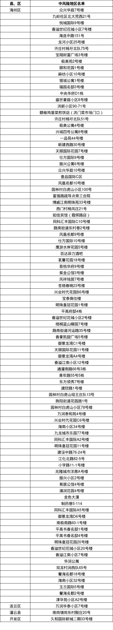 海州区润琦苑3号楼、天景美地4号楼、温侨绿苑B2由中风险地区调整为低风险地区。