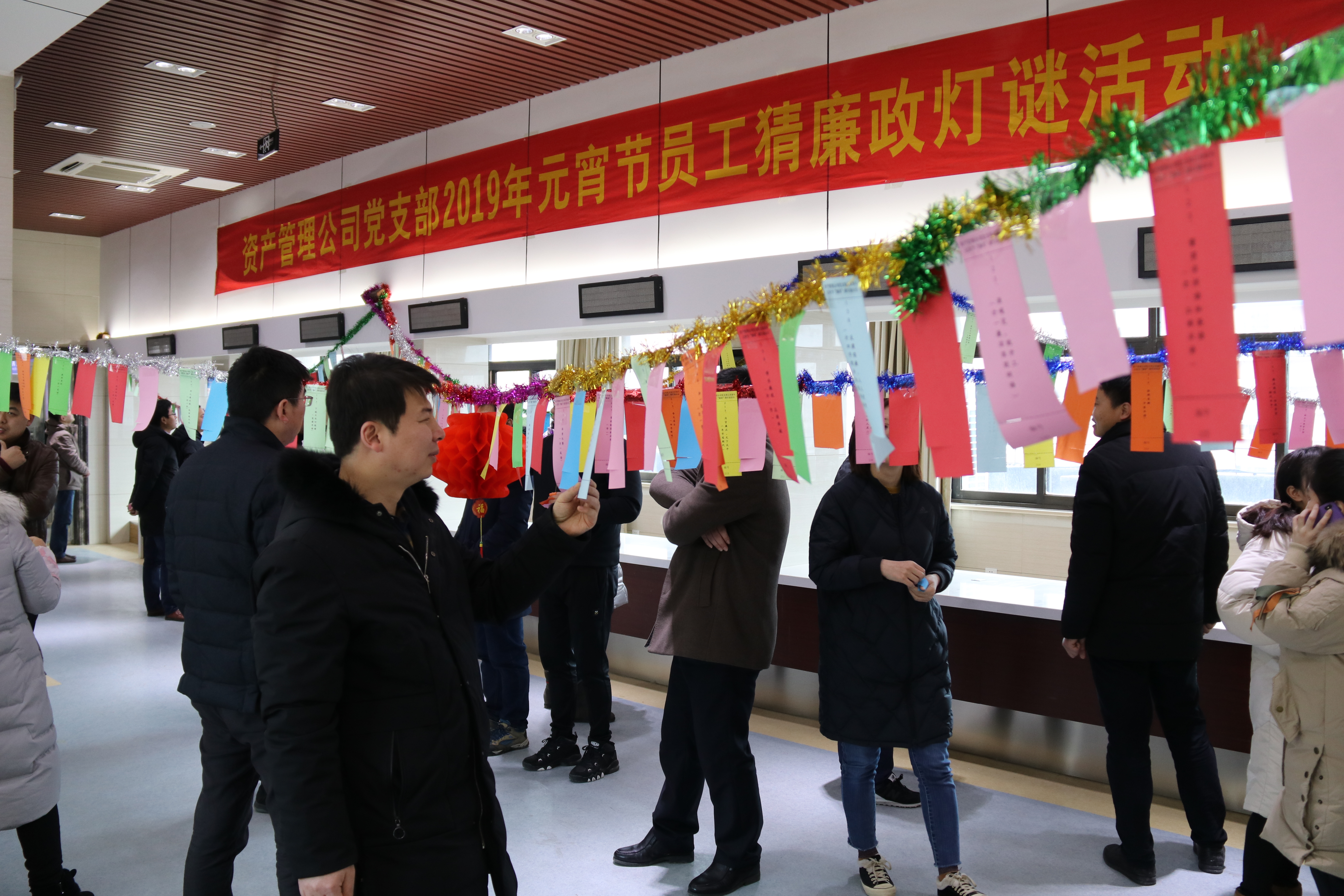 为弘扬传统文化,丰富员工文化生活,营造文明和谐、健康向上的文化氛围,让员工在体验文化魅力的过程中度过一个温馨、愉悦、祥和的元宵佳节。2月19日,资产管理公司党支部以“树文明新风、倡廉洁文化”为主题,举办2019年元宵节猜廉政灯谜活动,在欢度佳节的同时,“触摸”廉政文化、接受廉洁教育。