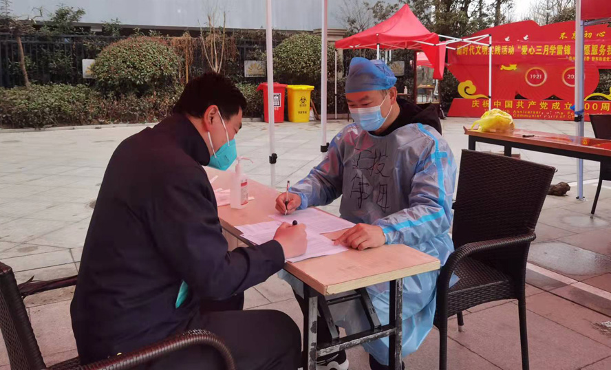 核酸采样检测高效完成。“居民们请注意,咱们小区黄码检测点启用了,请健康码为黄码的居民到这边排队,请大家佩戴口罩,有序排队检测。”“金房子”志愿者拿着喇叭喊道。由于该小区部分楼栋被列为中风险区域,部分居民健康码转为了黄码,为此,志愿者小分队协助社区开设了健康码“黄码”人员核酸检测专用采样点,解决健康码“黄码”人员核酸检测难的问题。他们从早上7点钟开始一直坚守在核酸检测一线,直到下午5点多钟,终于结束了一天的志愿服务工作,脱下了防护服“战袍”,肚子“咕咕”地闹了起来,这才想起竟十几个小时没有喝水、吃饭、上厕所了。