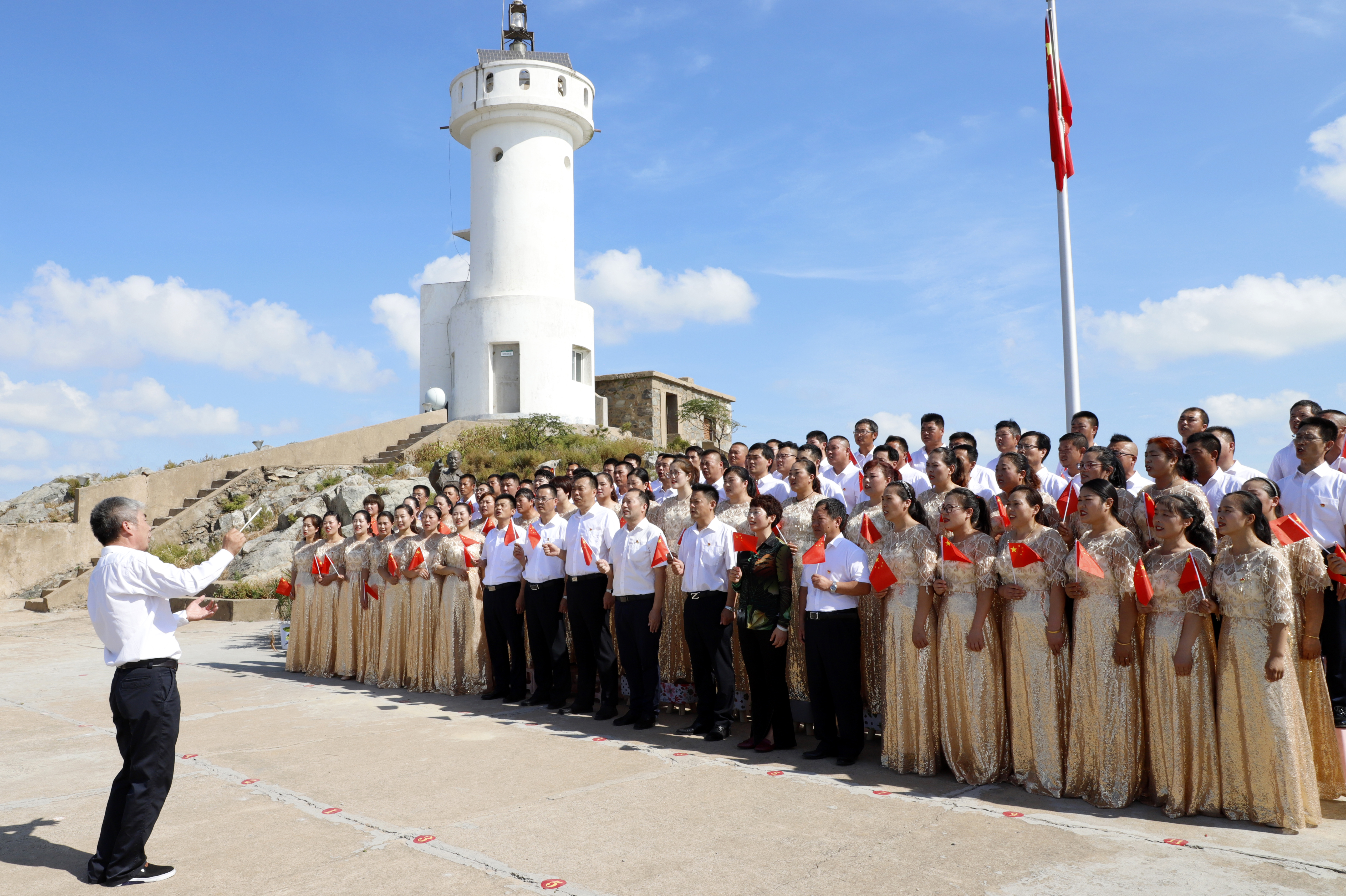 10点35分,升国旗平台成了简易舞台,慰问演出在舞蹈《红红火火大中国》中拉开帷幕,为岛上增添了节日的氛围,百名党员一起和唱了《我的祖国》共同迎接新中国成立70周年的到来。随后在实境课堂观看了《孤岛32年》,通过影片学习王继才同志对党忠诚、矢志报国的政治品格,学习他一诺千金、终身不悔的朴素情怀,学习他立足平凡、追求崇高的人生境界,学习他扎实工作、默默无闻的奉献精神。