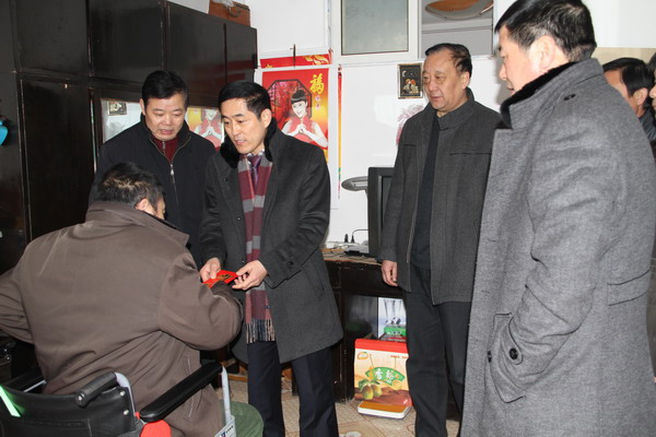 1月23日,在公司党政主要领导陈雨华陪同下,集团公司党委副书记郑宜虎走访慰问了巨龙农贸市场困难职工徐杰、刘元国等家庭,并送去了慰问金。郑书记详细询问了职工家庭生活、身体状况、有何困难,鼓励他们坚强起来,树立信心,战胜困难和疾病,并预祝他们过一个愉快的节日。徐杰等困难职工深受感动,感谢组织的关怀,并表示要克服困难,让组织放心。 集团公司组宣处处长江舜军和公司领导卢明生、王志军等陪同走访慰问。﹙司宣 卢正清﹚