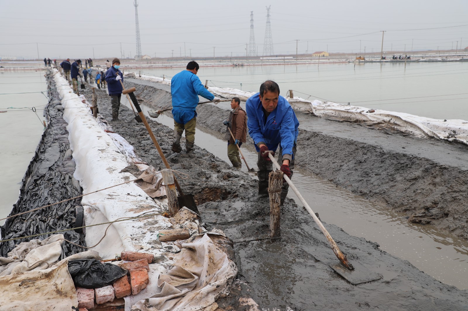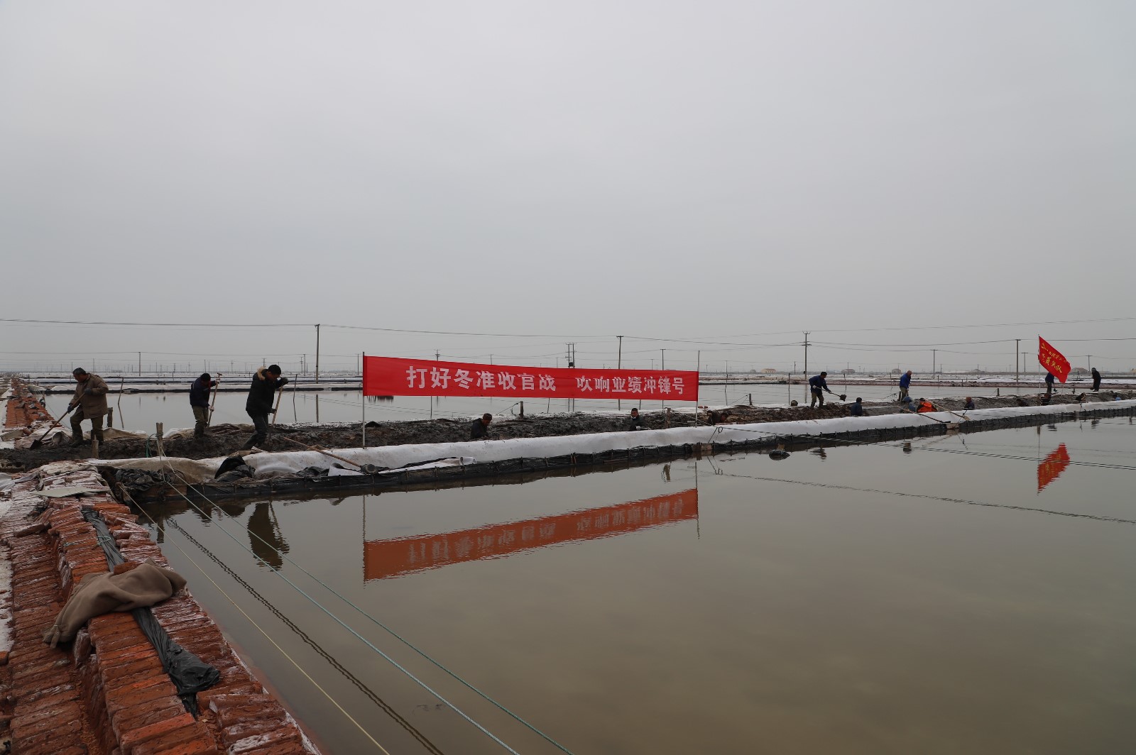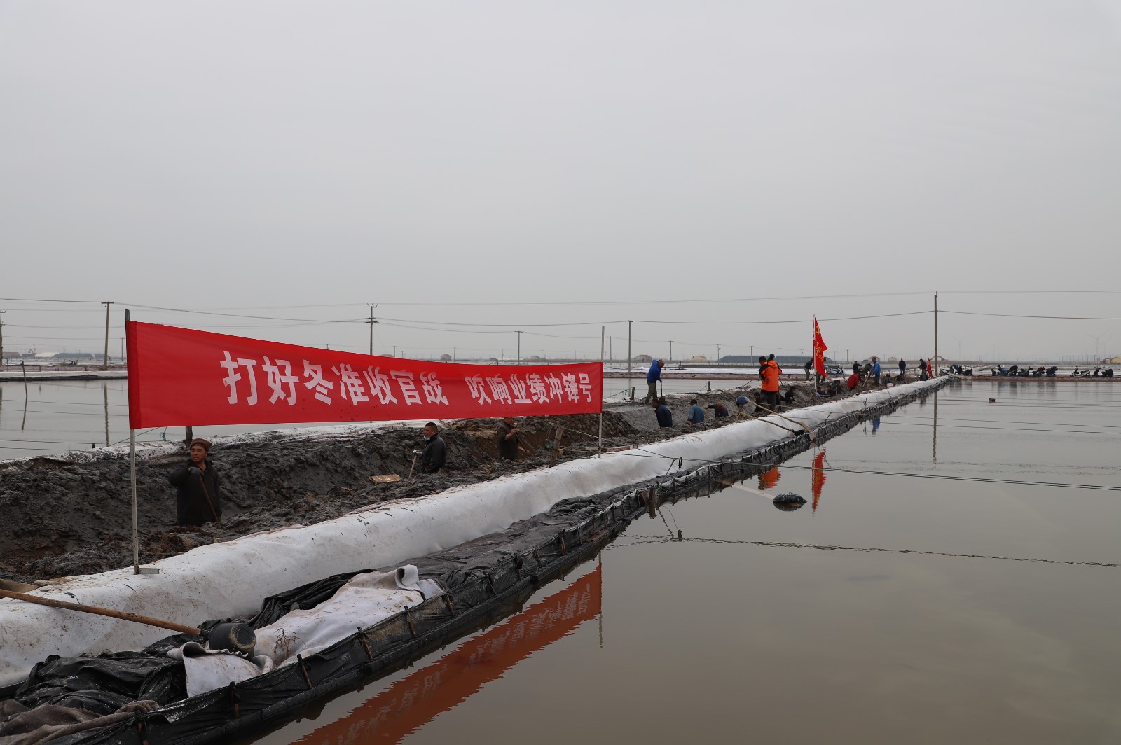 在新河制盐分公司盐田地头的冬准会战现场,人头攒动,工人们正动作娴熟的进行浇水、翻泥、踩实、做埝、整平……,盐工们全力争先进位,手脚不停的挥锹挖泥,呈现出你追我赶、比肩发力的劳动场景。一条条沟道改造、格堰修整等亮化滩场文明建设焕然一新,一幅幅“人勤春早”的美丽画卷徐徐展开。