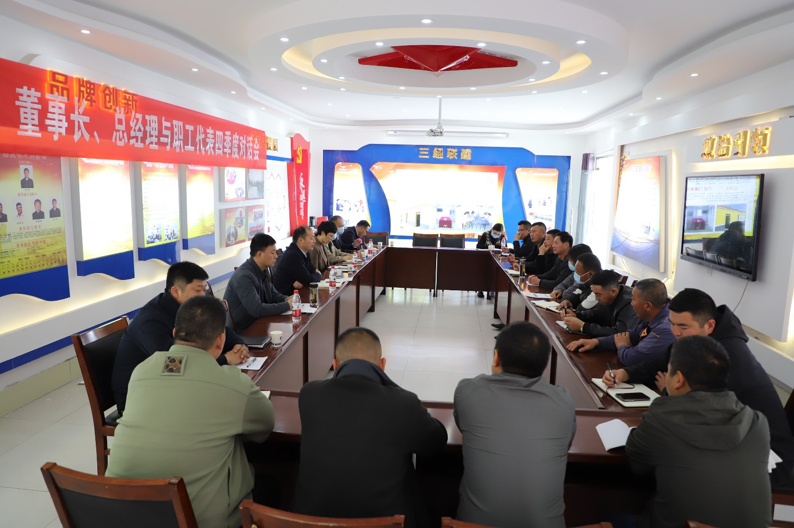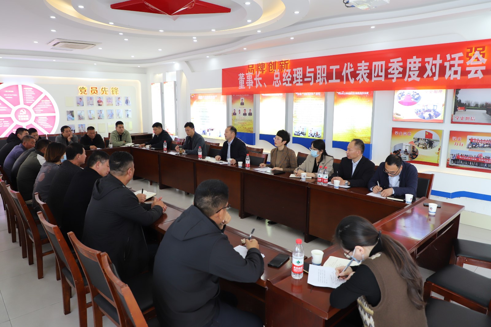 2022年11月3日下午,职工代表与公司董事长、总经理齐聚一堂,就生产生活中遇到的问题提建议、献良策。