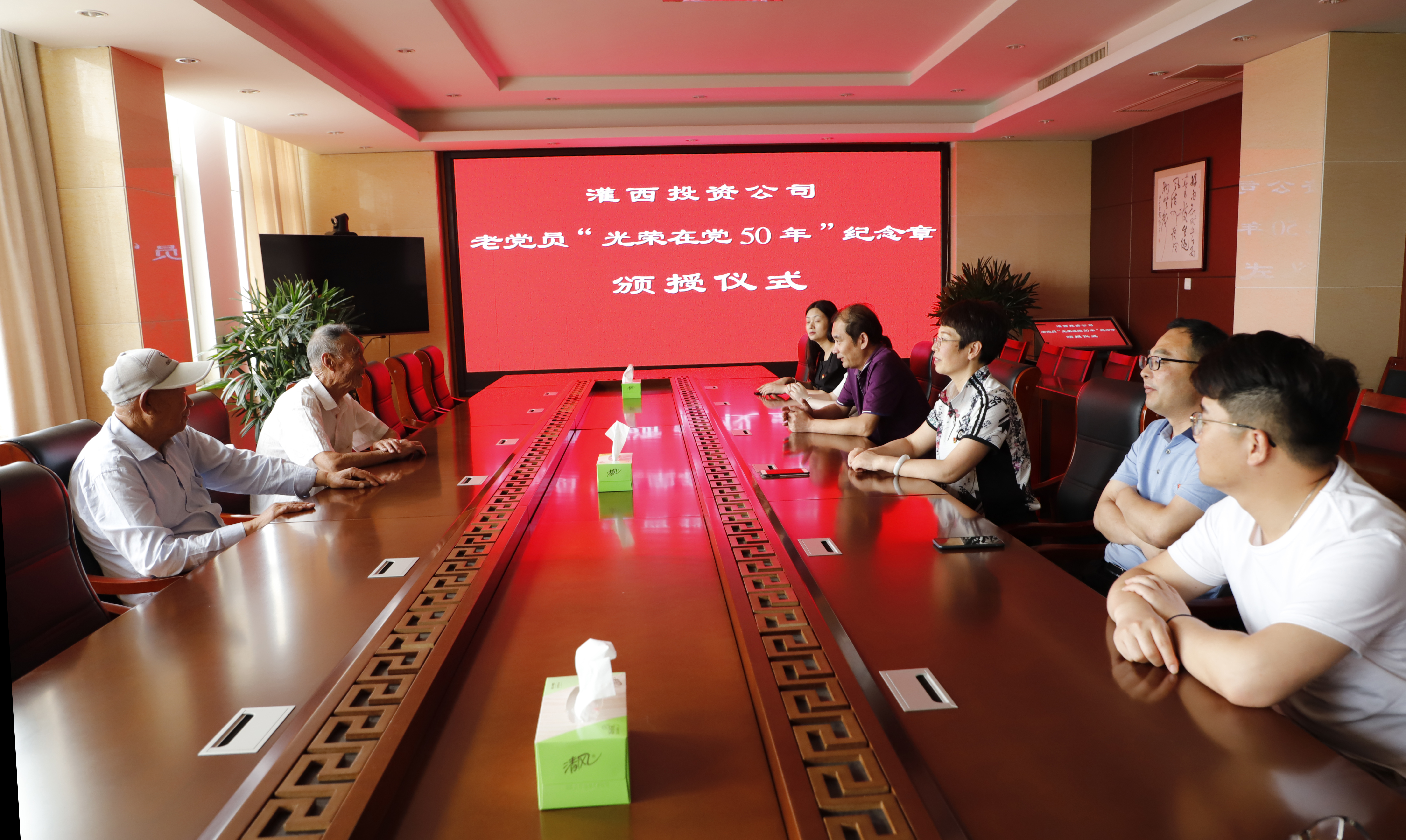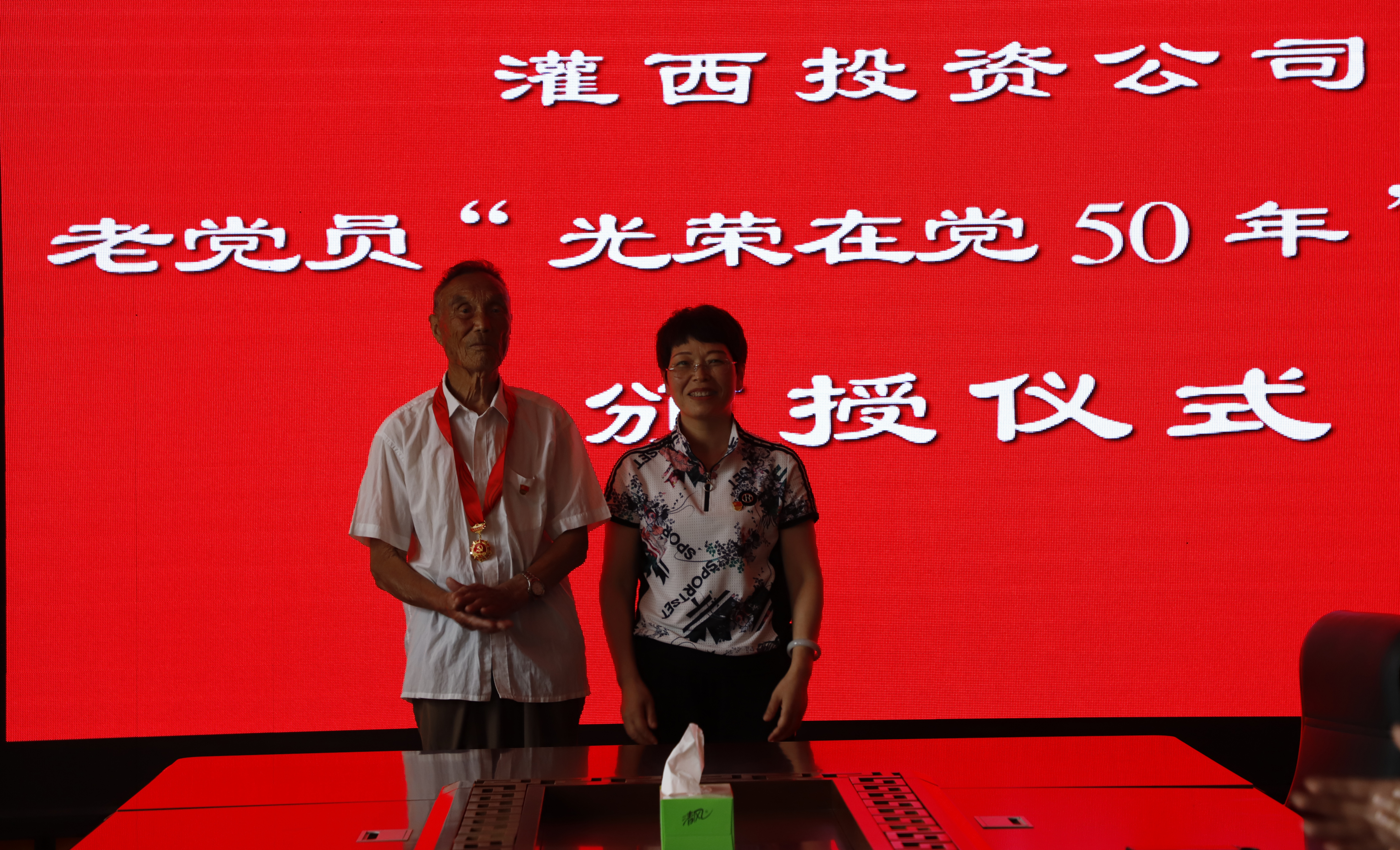“五十年党龄,五十载光荣”。6月29日下午,灌西“光荣在党50年”纪念勋章颁授仪式在机关三楼举行,投资公司党委副书记、工会主席王宏向党龄达到50年的两位老党员代表颁发纪念章,工会、党群、纪委人员参加颁发仪式。