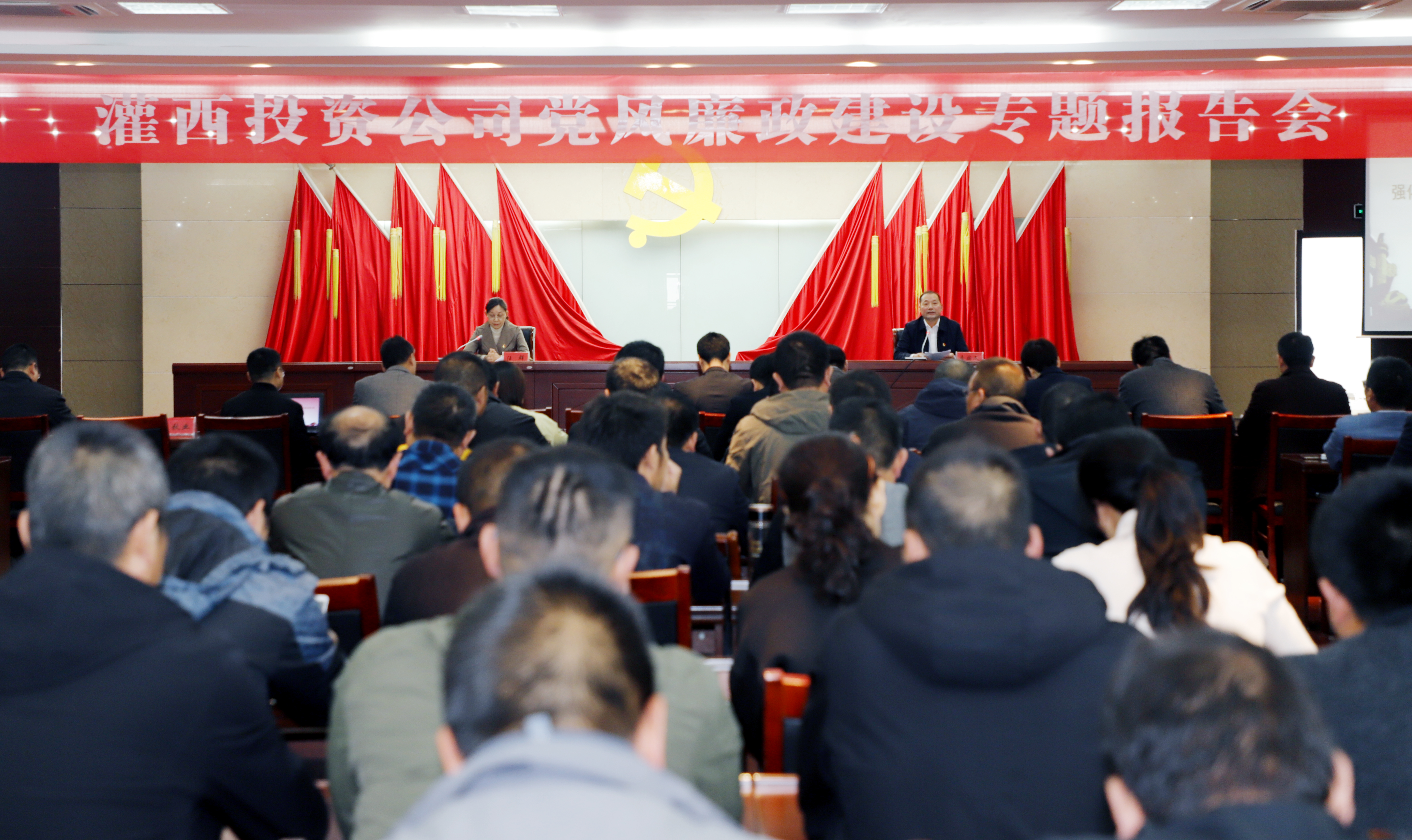 11月17日下午,灌西投资公司邀请集团纪委书记汪群在机关五楼会议室为党员干部作党风廉政建设专题报告。投资公司党委书记、董事长、总经理李国文主持会议,公司领导班子成员、各单位党政负责人、共建单位神特、奥神纪检人员、机关全体管理人员100余人参加会议。
