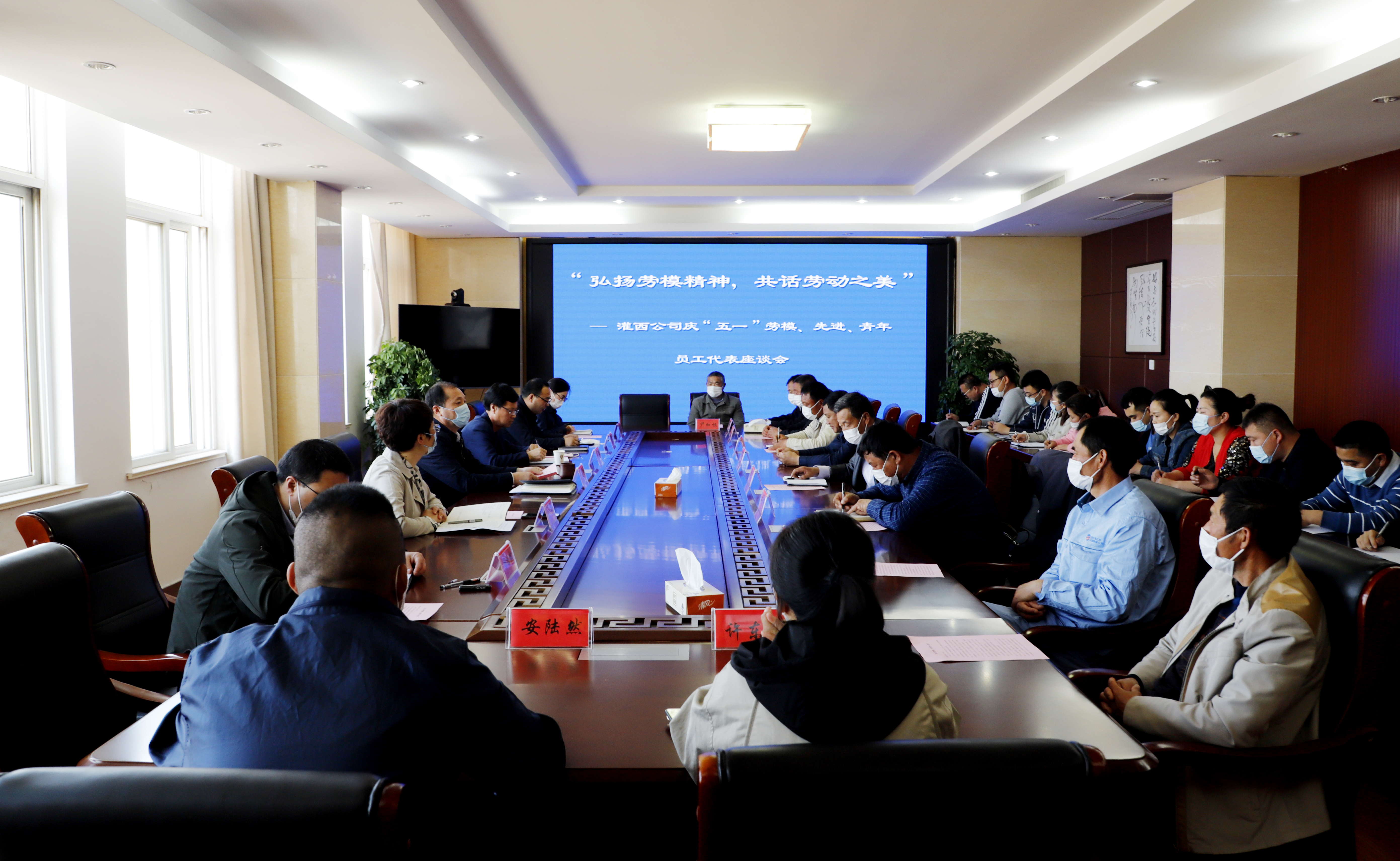 为庆祝五一国际劳动节,进一步弘扬劳模精神和劳动精神,为公司的高质量发展提供精神动力。429下午灌西公司在机关三楼会议室召开庆五一劳模座谈会。党委书记、董事长、总经理李国文,常务副总经理古浩光,党委副书记、纪委书记、工会主席王宏以及来自公司各条战线的劳动模范、先进、青年员工代表40余人参加座谈会。