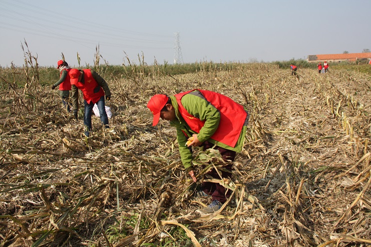 目前,位于柴门居民点附近的灌西实业公司农田已进入作物收获期,由于所种玉米已经完全成熟,且经历了一次大风降温天气,所以在机械进场作业前,有部分玉米已经掉落在了地上,如不及时捡拾,将造成极大浪费。公司团委在得知这一消息后,立即组织近十名青年志愿者利用中午休息时间,到该公司农田开展捡拾散落玉米志愿服务活动。活动中,大家手拿编织袋,排成横排仔细搜寻并缓慢向前推进。由于玉米皮与秸秆颜色相近且混杂在一起很难分辨,因此大家在捡拾过程中不仅需要认真搜寻,有时还需要弯腰翻动秸秆,以最大限度的不遗漏任何一个散落的玉米。