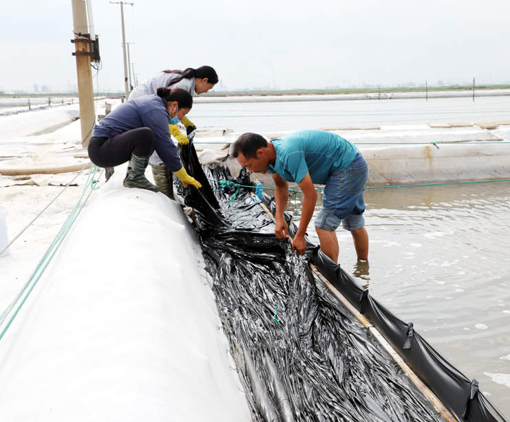 8月15日早,在制卤区2班,班长王春好带着班组的工人准备干活,安排好每个人的工作后,大家拿起工具上滩,工人们分散开来,各自忙着手里的活。工人们前后排开,弯腰俯身,用铁锹挖沟做堰,为下雨排淡水做好准备。“踩在卤水里能感觉像是在“烫脚”,太阳把卤水晒的滚烫的。”领滩手王春好用衣袖擦着脸上的汗水说,自己在滩上干了有七、八年了,对于这样的工作环境已经适应了。进入八月以来,连续7天最高温度达到35以上,台风过后,今天的气温也达到了33度,令今年这个夏天,成为有完整气象记录最热的夏天。跑水工仇海滨,到滩上一个多小时,以是大汗淋漓,他带领工人做一些修堰、补塑布、紧绳、还有查跑道头的活。