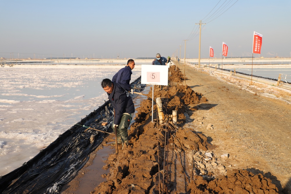 寒冬时节,暖阳之下,盐廪之旁,晒得黝黑的盐场产业工人们按照竞赛的考核标准,做熟泥、打堰墙、做堰顶,护埝顶、夯埝坡、清塘底,见证了一场技能比拼的盛会。经过一天的鏖战,潘成军师徒取得了池堰修整第一名;董治波师徒取得了土塘清淤第一名。(西工)