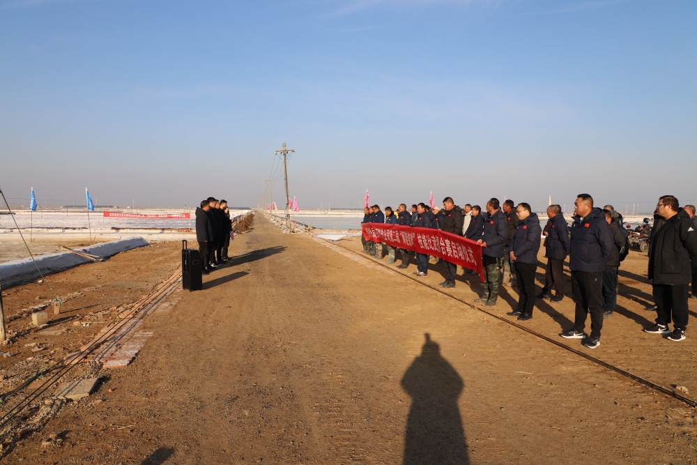 在新河制盐分公司5班滩头,总经理吴卫平作动员讲话,裁判长沈玉波宣誓,董事长孙政权宣布“‘薪火灌筑 匠星西传’师徒结对擂台赛”正式开始!