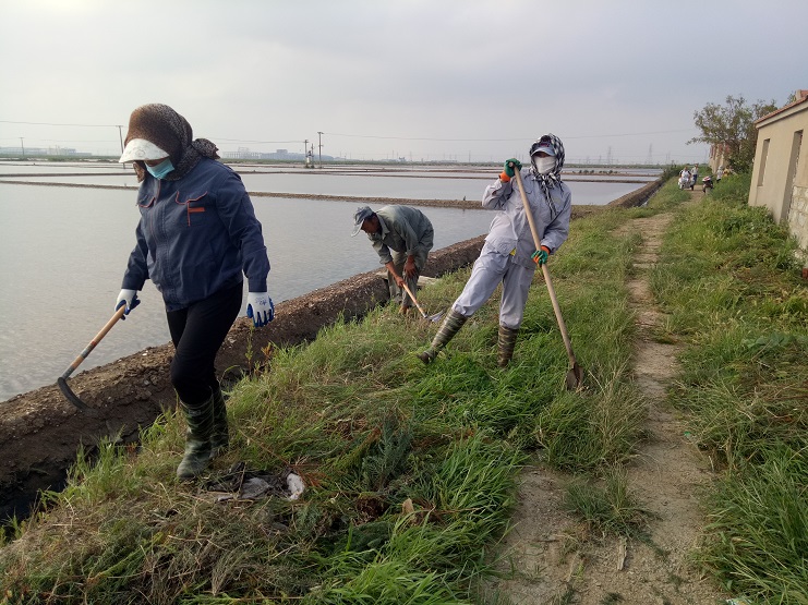 近日,实业公司海盐基地,柴门区三个班组加紧对滩场进行除草行动。夏日杂草丛生,严重影响滩容滩貌,且对滩格、沟道等造成制卤障碍,各班组长带领工人紧抓时间、人机结合除草。截止今日,三个班组共除草九千余米。(实业公司)