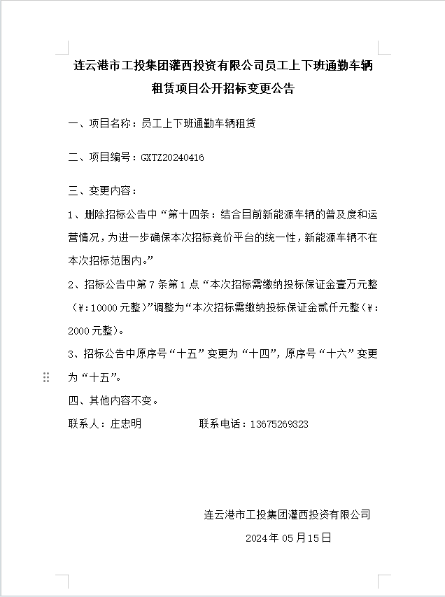 连云港市工投集团灌西投资有限公司员工上下班通勤车辆租赁项目公开招标变更公告