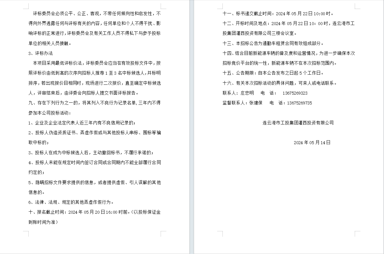 连云港市工投集团灌西投资有限公司员工上下班通勤车辆租赁项目公告