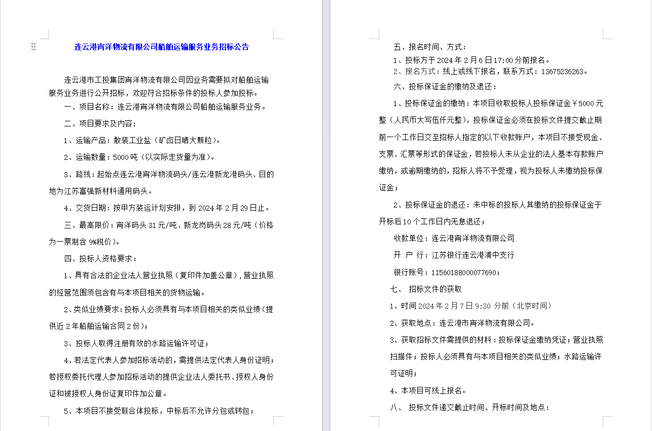 连云港宵洋物流有限公司船舶运输服务业务招标公告