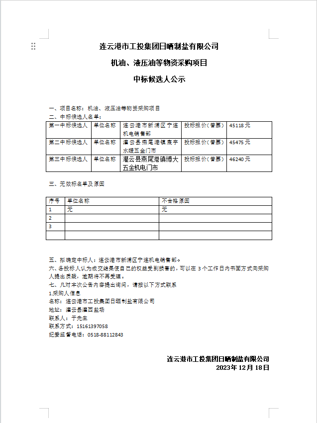 连云港市工投集团日晒制盐有限公司 机油、液压油等物资采购项目中标候选人公示