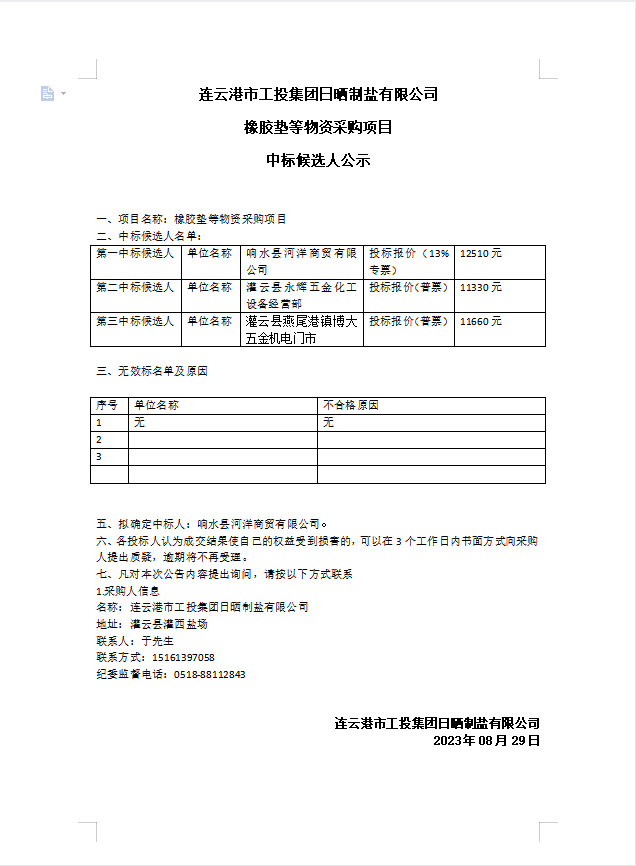 连云港市工投集团日晒制盐有限公司橡胶垫等物资采购项目中标候选人公示
