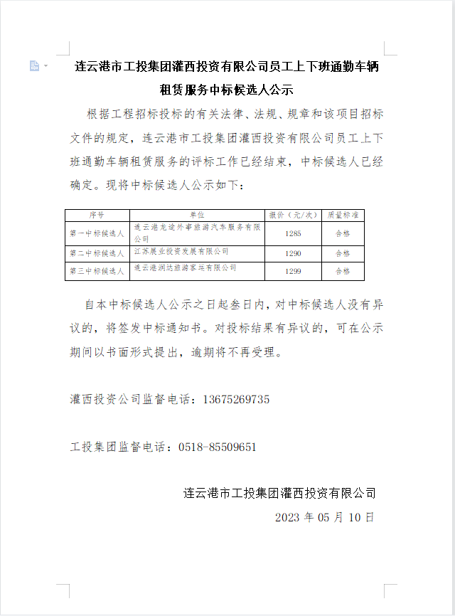 连云港市工投集团灌西投资有限公司员工上下班通勤车辆租赁服务中标候选人公示