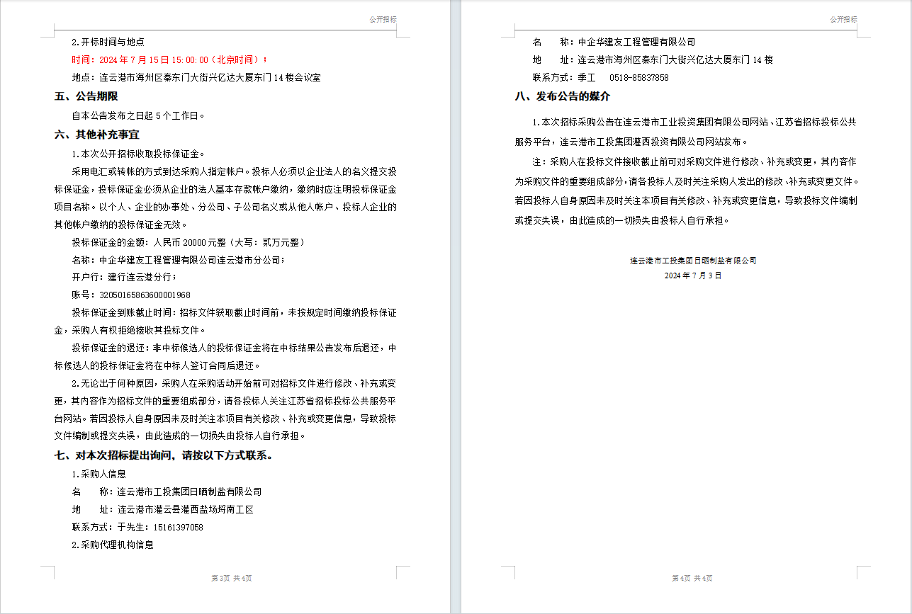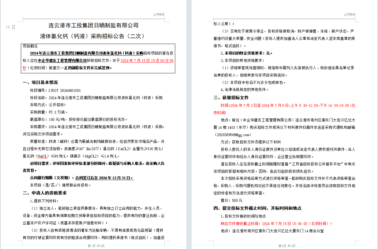 连云港市工投集团日晒制盐有限公司液体氯化钙(钙液)采购招标公告(二次)