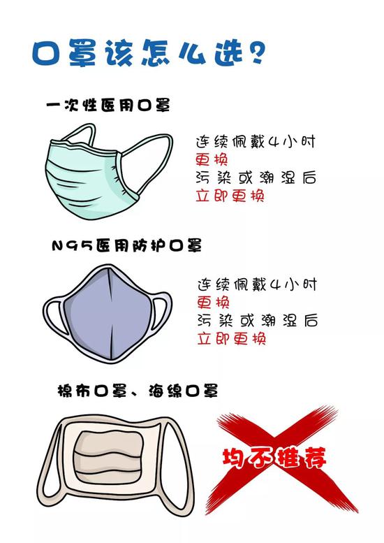 选择一:正常外出时选择一次性医用口罩即可,连续佩戴4小时更换,污染或潮湿后立即更换;