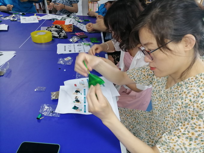 制作香囊时,大家认真研究、相互探讨,经过半个多小时细心的缝制,一个个神形兼备的“粽子”香囊呈现在眼前。