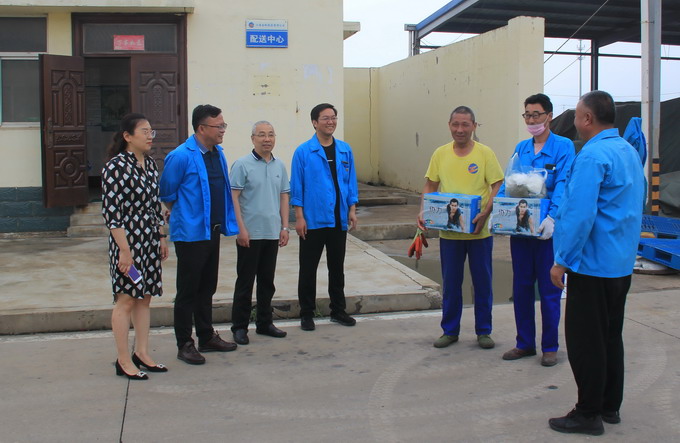 6月24日,我公司工会开展夏季“送清凉”活动,党委副书记、工会主席曹开明、副总经理张学峰和田磊一行,为高温下的一线职工送去了绿豆、白糖、饮料、茶叶等防暑降温品。
