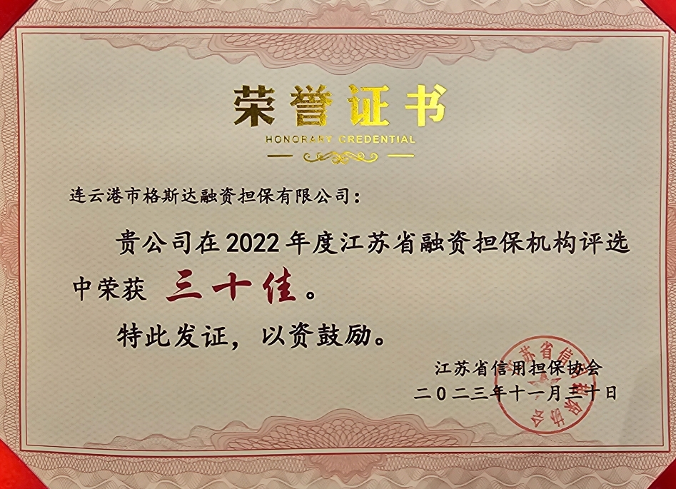 3月23日,江苏省信用担保协会在南京召开会议。连云港市格斯达融资担保有限公司被授予“江苏省2022年度融资担保机构三十佳”荣誉。本次全省共有71家融资担保机构参加评选,格斯达担保公司成功入选。