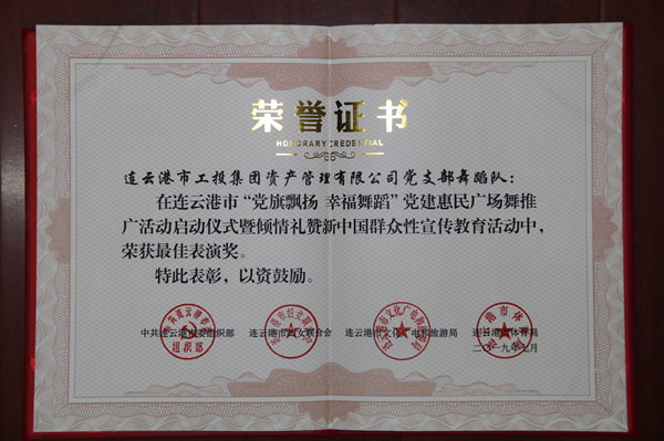 716日,连云港市“党旗飘扬幸福舞蹈”党建惠民广场舞推广活动启动仪式暨群众性宣传教育活动在市文化艺术中心举行。启动仪式上,来自工投集团资产管理公司舞蹈队登台展演,荣获市委组织部、市妇联、市文广旅局、市体育局联合颁发的“最佳表演奖”。