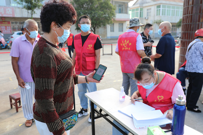 为保障核酸检测工作顺利进行,青口公司党员服务队志愿者和黄沙坨社区工作人员,提前划分好信息登记组、人员引导组、秩序保障组和后期保障组,全方位协调管控核酸检测现场,保障活动顺利开展。在核酸检测开始前,不少居民已经来到核酸检测现场排队等候,秩序保障组的工作人员一边维持秩序一边拿着小喇叭,在一旁提醒大家:请大家规范佩戴口罩,主动出示苏康码和行程码,保持一米线安全距离,准备好身份证、采样码,有序排队。同时,青口公司志愿者们还积极帮助没有智能手机和不会扫码的老年居民,进行二维码扫码登记,提高了核酸检测的效率和速度,也让拘谨的老人露出了笑脸。