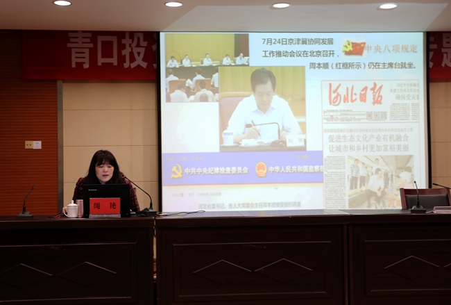 为进一步强化作风建设,增强党员干部廉洁从业意识, 1 月 11 日上午,青口公司邀请市纪委 党风政风监督室主任绳艳 作了题为《落实八项规定精神 从严从实改进作风》的专题报告,集团纪委书记汪群、公司领导班子成员和全体在岗党员参加此次讲座,讲座由党委书记、董事长胡传法主持。