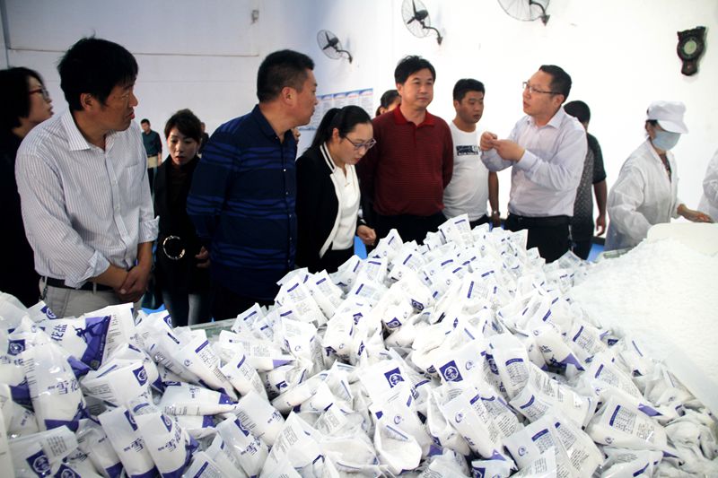在金桥制盐的企业文化墙前,朱董事长为大家详细介绍了公司在盐业体制改革下面临的困难和挑战,公司是全国 99 家定点原盐生产企业,江苏 5 家生产企业之一,连云港市唯一一家定点食盐生产企业,国家不在新设定点厂家的前提下,面临食盐是供过于求的买方市场,价格竞争激烈的新形势,企业只有找准定位,自加压力来扩大优势,才能要这次大变革中迎难而上。挂职干部一行在雪花盐生产和小包装食盐的包装车间参观了各类盐产品生产的工艺流程。(杜 娟)
