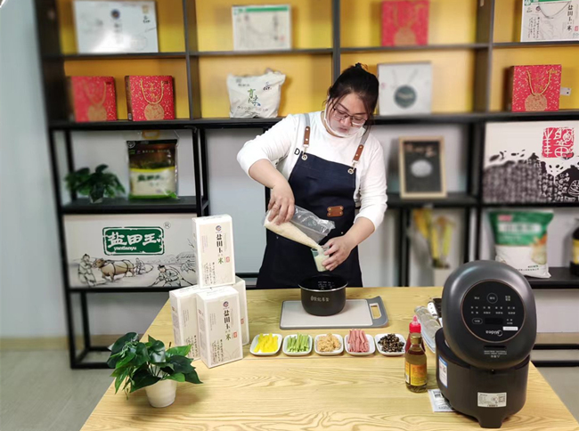 为提升“盐田玉”品牌网络知名度,近日,米业营销中心开展盐田玉大米美食直播月系列活动,首期美食直播现场,主播用盐田玉大米制作寿司,解锁味蕾体验。