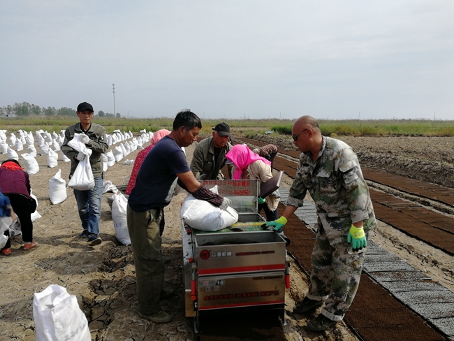 地头播地龙育秧是最近两年引进的机械化育秧方式,通过覆基质、播种、再覆基质,一次性完成播盘任务,条田工之间自愿组合合作购买播种机,互相配合共同完成育秧作业,大幅节约了成本、人工,减少了运输、摆盘期间损苗现象;大棚塑盘暗化育秧,条田管理工互帮互助,自行组织运输车辆转运秧苗至田头,将转运时间由一天半压缩至半天就能完成,并顺带空盘回大棚,不仅减少了转运时间,大大降低了运输成本,又促进了职工之间团结互助关系。