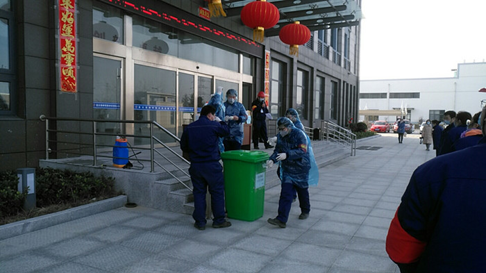 发热员工被救护车运送出厂区后,乙班班长封安带领员工对隔离间进行消杀。消杀、救护工作全部完成后,员工将防护服、口罩等防护用品全部按规定丢入废弃物垃圾桶,作密封保存待处理。