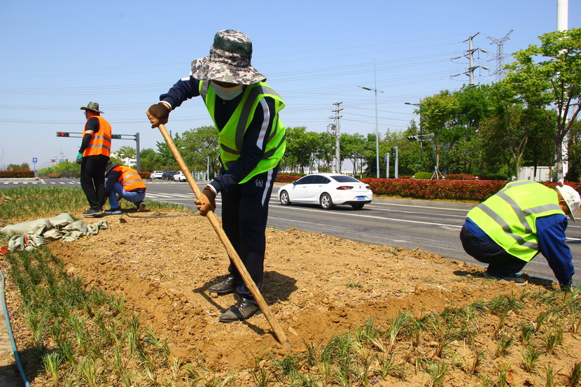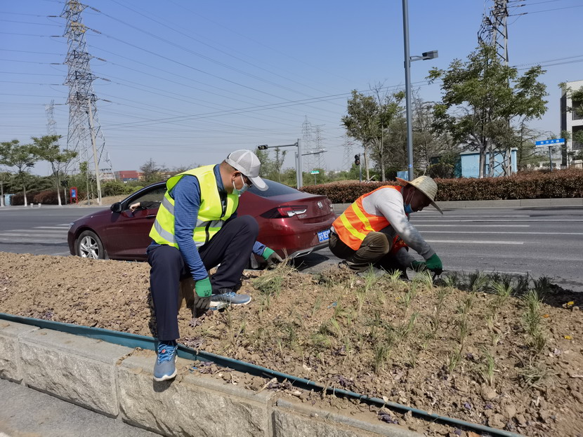 临达、美多利、资源分公司等党支部组织联合突击小队,从4月30日起主攻黄海大道绿化责任区,时至中午“不下火线”,党员职工就着矿泉水,啃着自带的煎饼,节约时间抢工期。