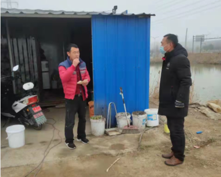 共产党员赵绍庆和朱文金在疫情期间,除了参观社区志愿活动,进行卡口值勤和卫生消毒外,还每天往返于公司各闲置土地之间。他们顶着寒风,穿梭于池塘地头间,向即将清退的养殖户宣传公司和清退政策,帮助人手不够的养殖户对养殖塘附近进行全面环境消杀,帮助即将退出离开的养殖户清理各类物资,帮助他们把需要带走的物品整理归类,以便尽早搬走,腾出池塘方便开发区征收。