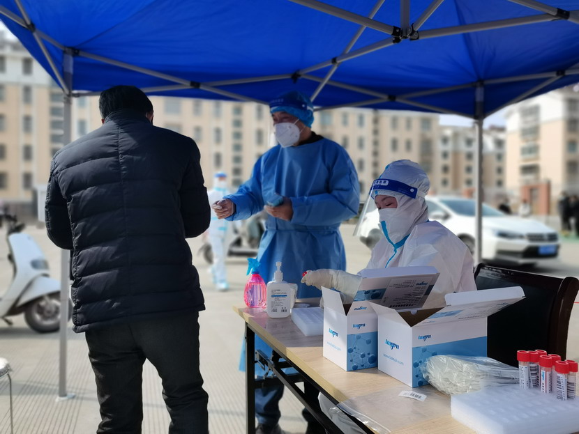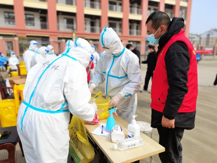 清晨6点30分,1号检测点,李明同志在检查物资,“大白”服装4套、“小蓝”服装6套、棉签600根……;2号检测点,于洪亮在将物资上桌,病毒核酸检测试管、棉签、消毒液,“还缺少一瓶酒精,我立即反馈给社区,请社区抓紧安排送来”;4号检测点,苏玲、秦黎明正在互相帮忙穿好防护服,“秦姐,这个防护面罩里外有两层薄膜,我给你撕掉,这样就不会有雾气了”,“嗯嗯,你这个拉链得拉到顶,我们自己也一定要做好防护”秦黎明温柔的说;5号检测点,内退党员孙芳和姜海洋,互相在防护服后背写上对方的名字,以便于更高效的完成检测工作;6号检测点,霍正钢、朱文健、韩永刚、邱荣滨正在清点检测小卡片;7号检测点,张强在拿着酒精给废物处置垃圾箱消毒;8号检测点,新加入的孙银、占恒春、尹永明、韩永光、赵绍庆正在给消杀喷雾剂灌装84消毒液,社区8个检测点的消杀工作全部由昌圩临时党支部志愿者负责。