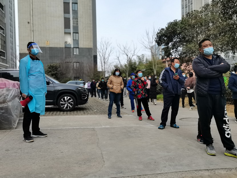 李明:“请大家站好,保持一米线的距离,很快就排到了,不要急躁。”