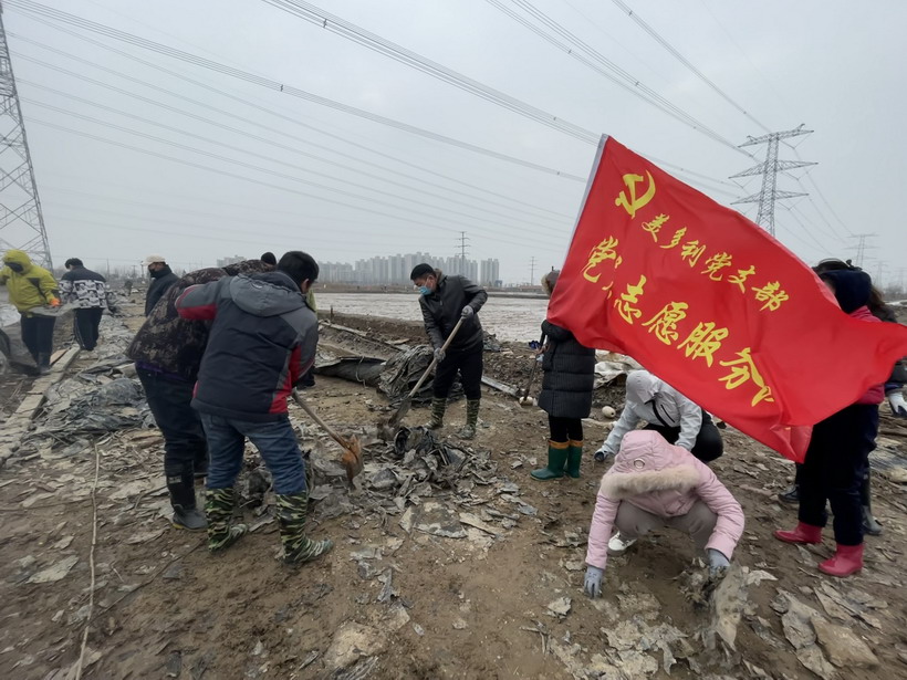 寒风中,志愿者们忙碌在盐滩上,充分发扬不怕累、不怕脏的精神,对附近区域的垃圾、杂物进行清理。经过一个下午的辛勤劳动,共清理废弃的塑布、木板等杂物十余车,用行动和汗水,扮靓了盐场人的家园。
