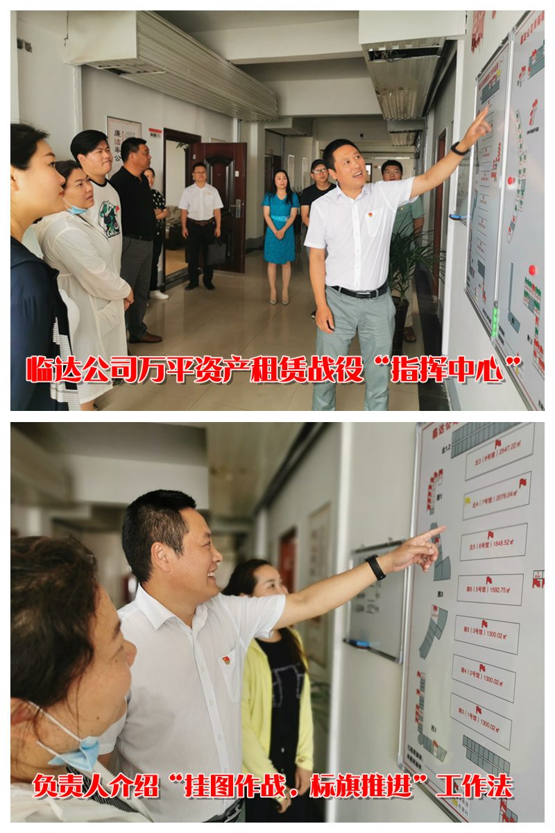 “分解任务,每天出租180平方,我们用挂图作战工作方法,在困难中找优势,在优势中找方法,将集中资产划分片区,分而治之,实行一个片区一个目标导向,一个片区一个工作方法”“临锋而行,达道致远,这是临达公司的立企宗旨,我们是这么喊,也是这么干的”“临达的年轻同志们是我们能够突破7200平方任务的秘密武器,他们上门商谈至天黑,周六周日让他们休息都不休息,依然坚守岗位跑市场”在临达公司的“作战指挥中心”,听取负责人杜洪波的介绍后,参加采风的同志都忍不住竖起大拇指为先拔头筹,超额超时完成任务的临达全体“指战员”点了个赞。