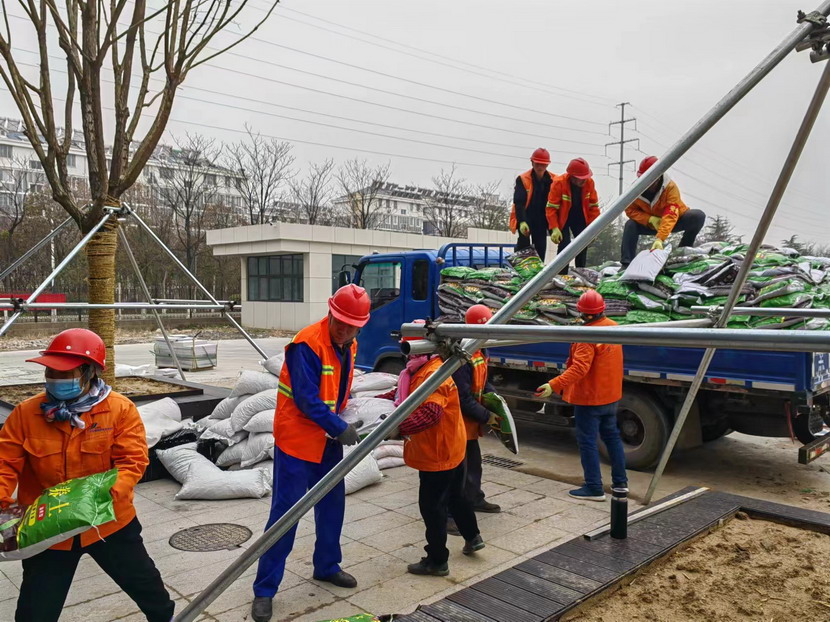 纳福花境面积为126㎡,施工周期27日至31日,共5天。此次栽植前工作不同于以往,要先在底部铺设排水板、土工布及2cm厚陶粒垫层,保证花箱底部透气性及在降雨时能及时排出积水,再铺设25cm厚黑泥土加20cm厚营养土拌5%沙,满足植物的生长需要,完成栽植后在土壤上层铺设2cm厚麦饭石。