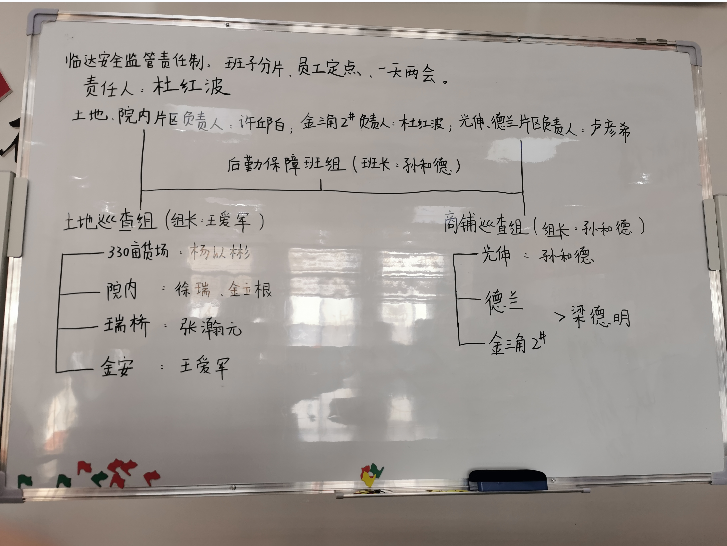 全面压实安全管理责任。建立全员安全责任清单,实施“重大安全风险公告”“岗前一分钟培训”等措施,成立土地、商铺两个安全巡检小组,形成“每日目标上墙,每日隐患汇总,每日强化整改”工作体系,切实提升员工的安全素质和管控能力。