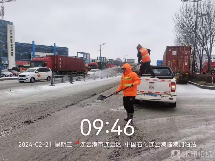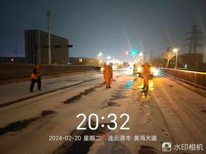 夜晚10点,在黄海大道,支部书记范晓宝亲自带队,带领张岩、盛小雷、薛加兵等6名党员,冒雪奋战、连续作业,抛撒融雪剂,进行紧急除雪除冰作业。