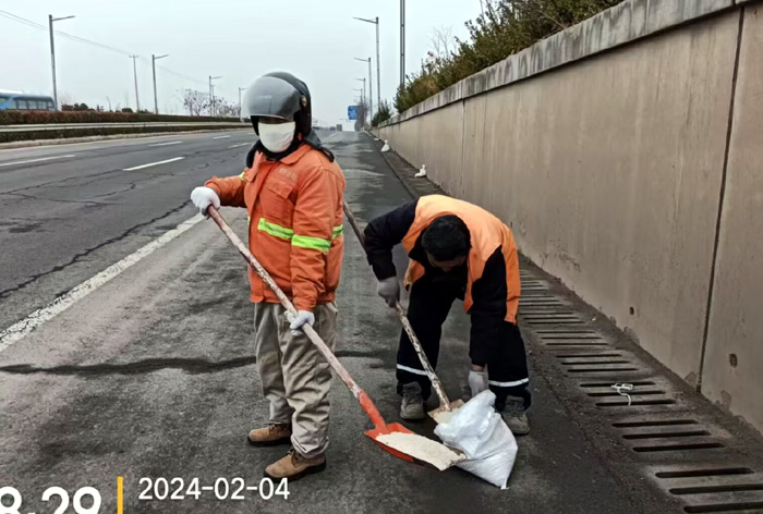 该分公司党员突击队兵分3路,分别来到徐圩大道、港前大道、海滨大道核心路段。生产骨干沈万军、李传武、张树华等同志他们相互配合,手拿铁锨简单有效的进行撒放融雪剂60余吨。发现道路低洼结冰处及车辆转弯口,他们立即下车利用雪铲,有来有回的将冰冻铲除,消除路面一切安全隐患。