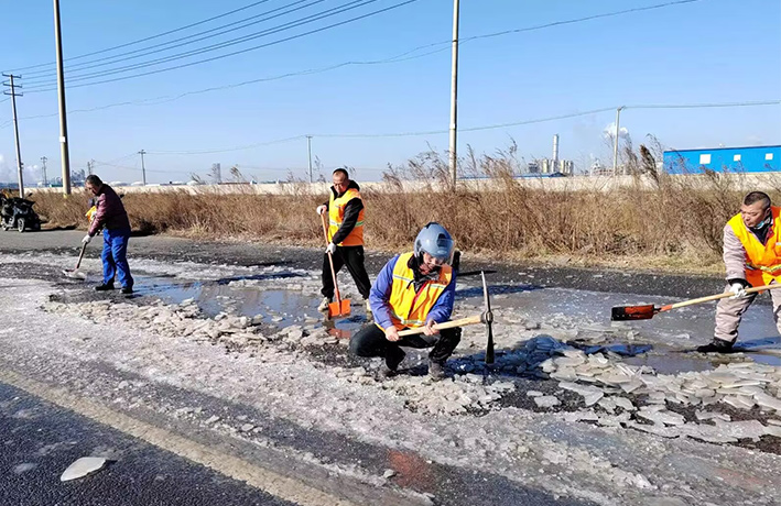 近期由于受冷空气影响,气温低下,园区道路低洼积水处产生大面积结冰现象,如不及时清除,严重造成车辆侧翻事故发生。道路排查现场,管理人员及时与园区二班对接,联合开展“破冰保畅通”突击活动。大家各负其责,齐心协力,挥动手中铁铣、羊镐,经过近4个多小时共同奋战,撬动冰块近400多块,清理积水300多平方、20多处。