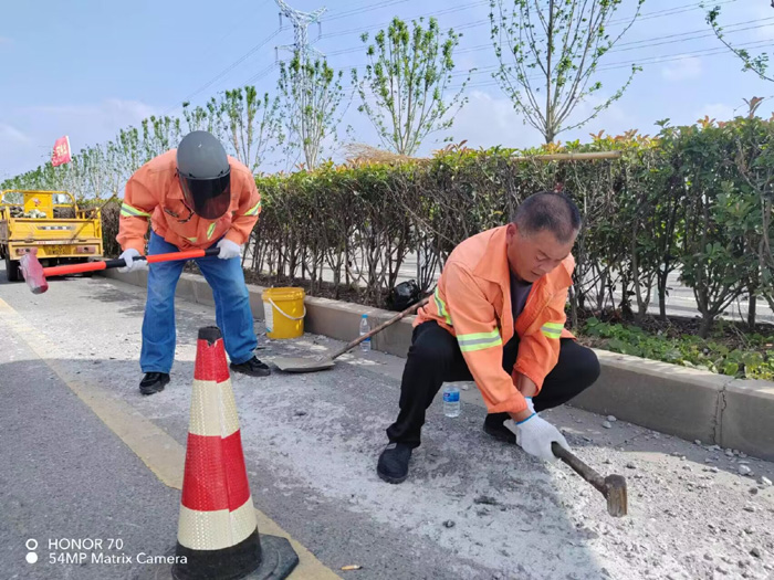 228省道西侧,班长姚功巡查时发现,有近50多米长混凝土搅伴物抛洒主干道路面,如不及时处理,严重影响路面行车安全。班长姚功及时召集队员,马不停蹄赶赴道路现场。上午10时左右,室外气温已经直逼35℃,大家顾不上天气的炎热,挥动手中铁锤,不停地震动路面“冻结”已久的水泥,党员胡可贵与同事徐育军、伏彩林主动参战,交替使用手中的撬棍,尽管汗水浸透橙色衣衫,双手磨出了血泡,大家也没有叫苦叫累,经过近三个多小的努力奋战,终于恢复原有黑色柏油路面。
